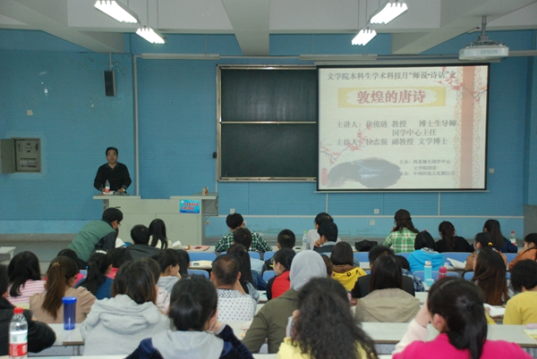 4月23日晚,beat365英国官网本科生学术科技文化月“师说•诗话”之“敦煌的唐诗”主题讲座于教学10号楼A区101教室举行。本次讲座由beat365英国官网博士生导师、国学中心主任伏俊琏教授主讲,杜志强副教授主持。全院300余名员工参加了讲座。